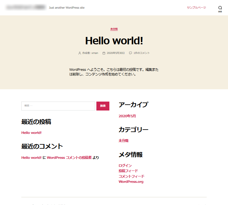 WordPressの設置完了というメールが届いたら、アクセスが可能になります。初期状態では以下のような画面が表示されますので確認してください。
