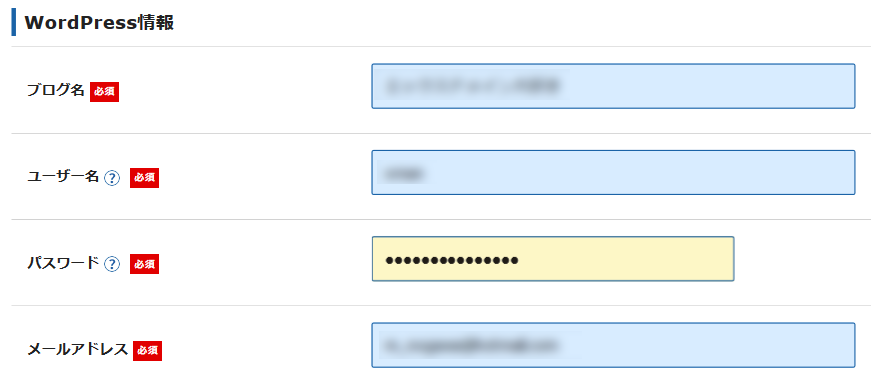 独自ドメインが決まれば、引き続きWordPressの情報を入力します。