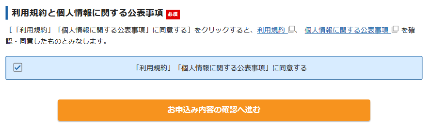 最後に「利用規約」と「個人情報に関する公表事項」に同意して、申し込み内容の確認へと進みます。